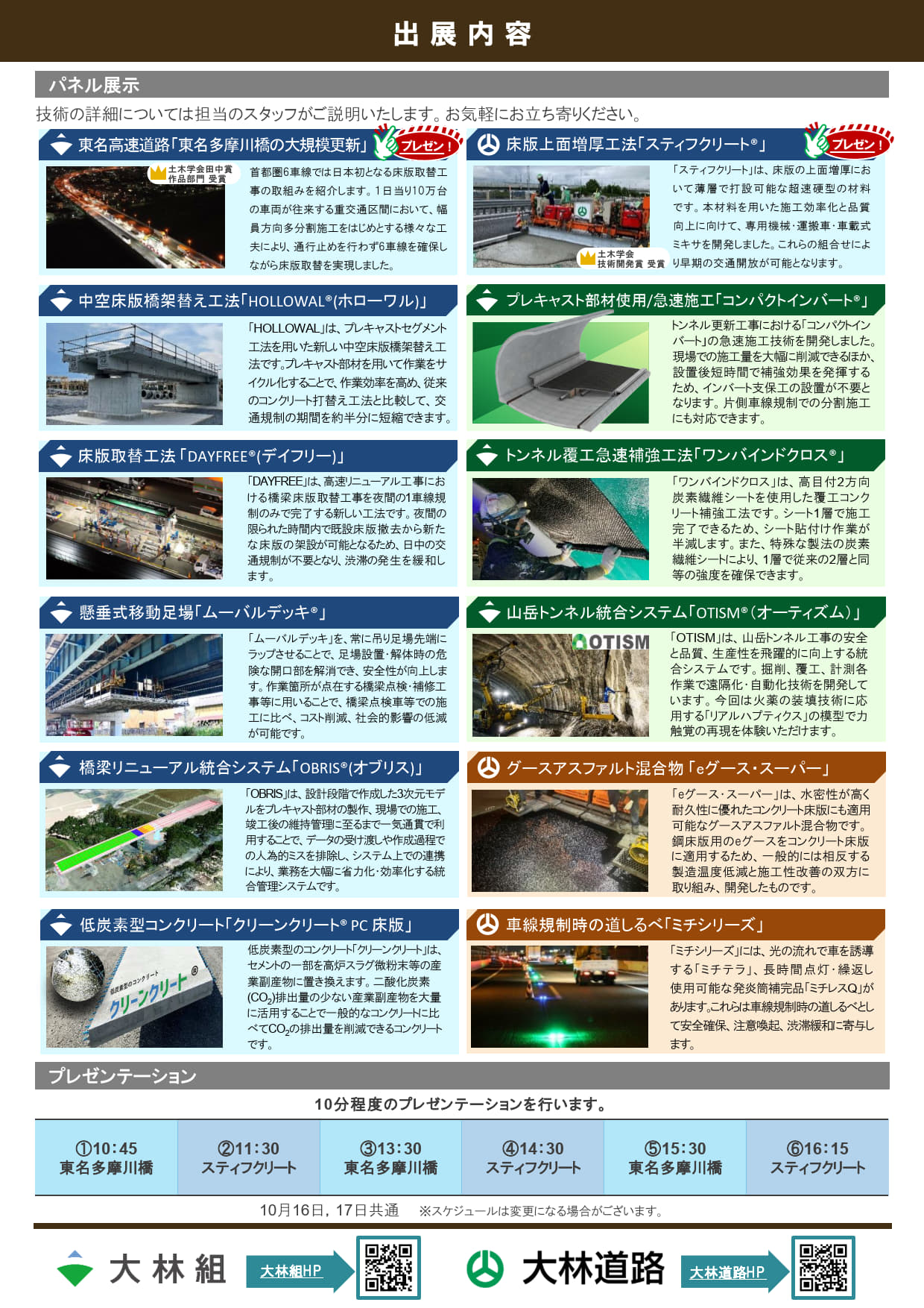 当社からは「床版上面増厚工法『スティフクリート』」、「橋梁レベリング層用グースアスファルト混合物『eグース・スーパー』」、「車線規制時の道しるべ『ミチシリーズ』」をご紹介いたします。