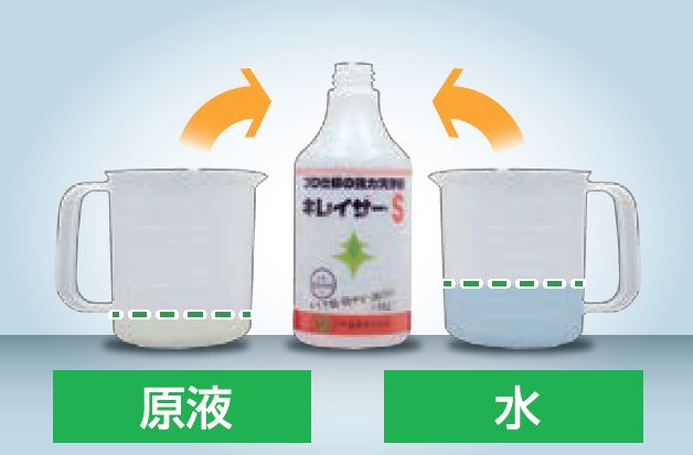 キレイザーSは3倍希釈し、ハンドスプレーで噴霧、ブラシで擦り布等でふき取った後、水洗いしてください。