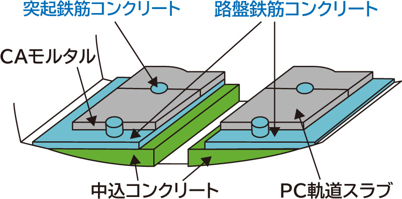 軌道用PCスラブの基盤となる路盤鉄筋コンクリートは、一般に、型枠設置→配筋→コンクリート打設という工程を、人力により施工しています。路盤鉄筋コンクリート・スリップフォーム工法は、型枠設置を省き、コンクリート打設を機械施工で合理的に行うものです。