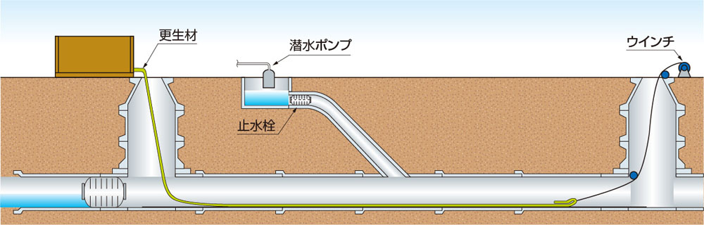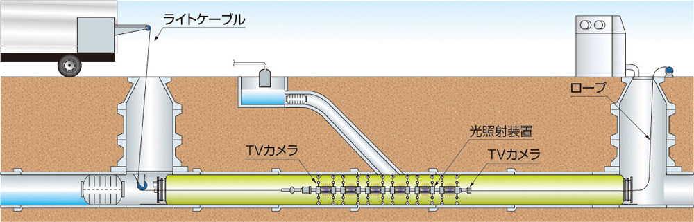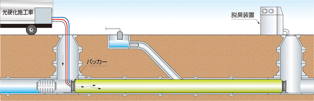 光硬化工法は、既設の下水道管や工場排水管等を非開削でリニューアルする工法です。