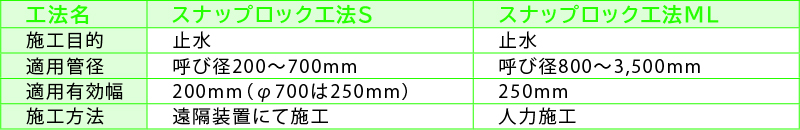 本工法には適用管径によりスナップロック工法Sとスナップロック工法MLの2種類があります。