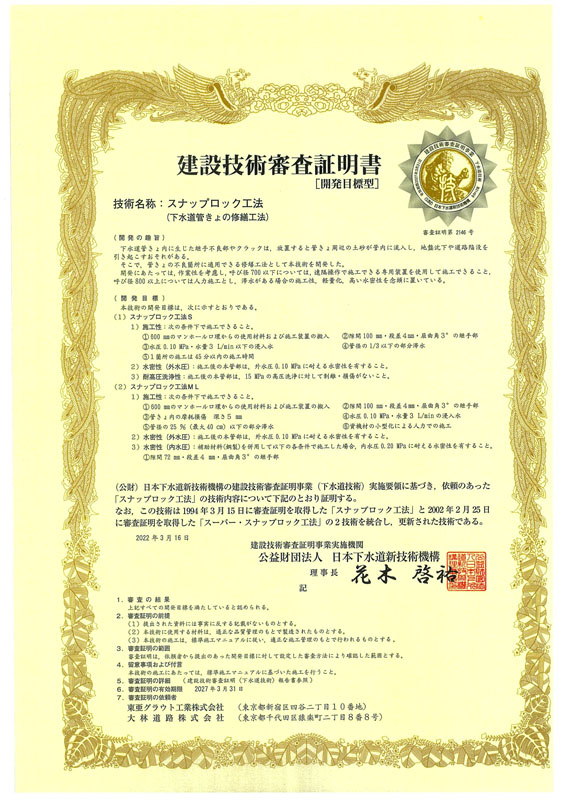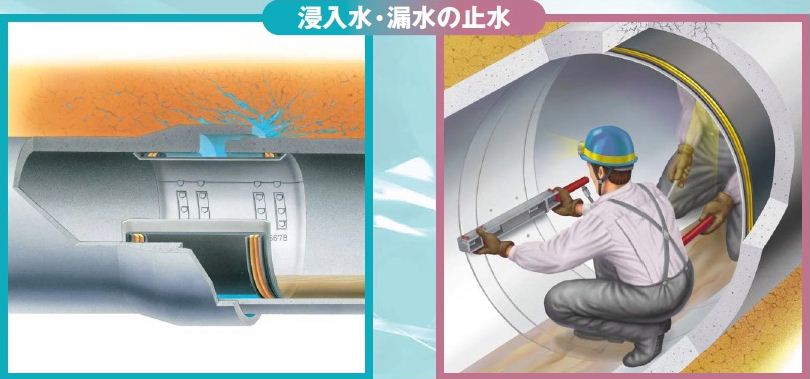 スナップロック工法は、継手部やクラックから発生する侵入水(漏水)を防止する非開削修繕工法です。