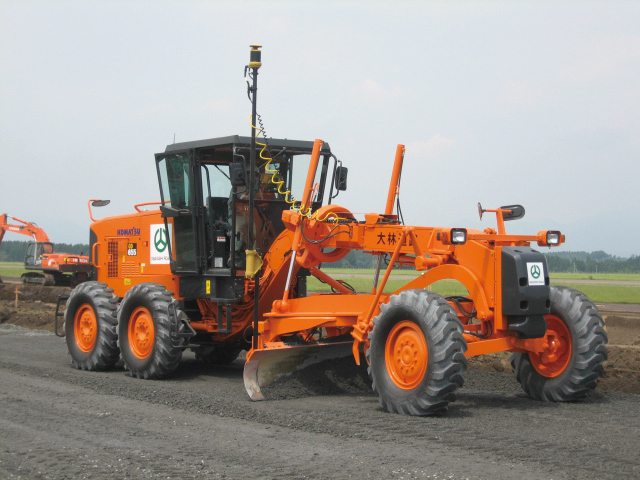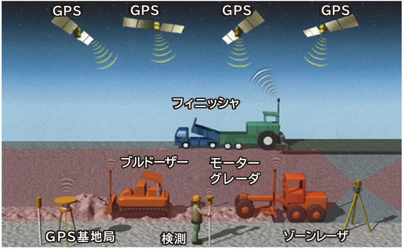 mmGPSは、人工衛星から位置情報を受信するGPSと、mm単位の高さ情報を提供するゾーンレーザを組み合わせて位置(座標)と高さの正確な情報を割り出し、事前に入力した設計データに沿って、複数の施工機械のブレードまたはアスファルトフィニッシャのスクリードを同時に3次元で自動制御するシステムです。
