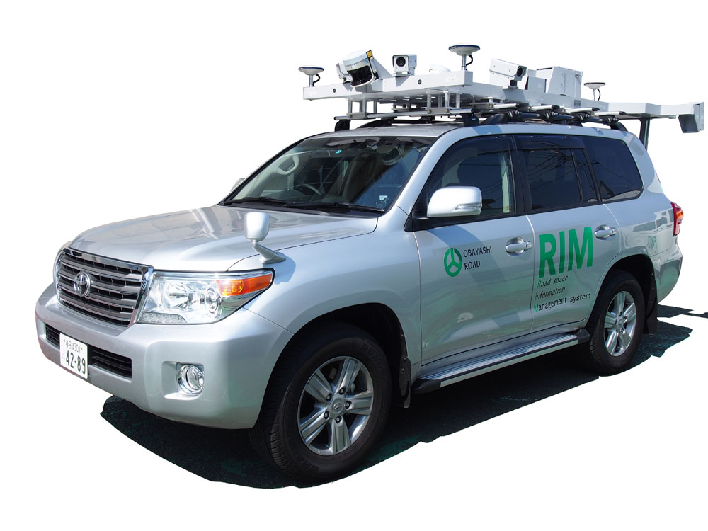 RIM (Road space Information Management system)は、GPSや高密度レーザスキャナおよび路面撮影用カメラを搭載し、舗装を含む道路空間の形状を広範囲に交通規制なしでmm単位の3次元点群データとして測定する装置です。