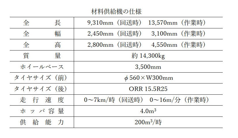 材料供給機は、アスファルト合材、生コンクリートや中詰材(砂等)をアスファルトフィニッシャやコンクリートフィニッシャ等の敷きならし機械あるいは施工箇所へ供給する装置です。狭小な箇所への材料供給が可能であり、従来、ホイールローダやバックホウで施工していたトンネル監視員通路の中詰工にも適用できます。