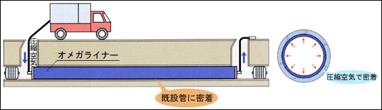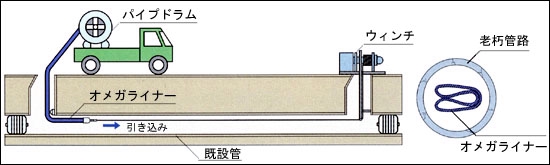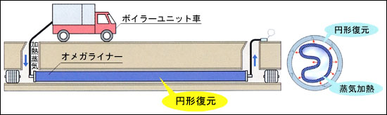 オメガライナー工法は、あらかじめ工場でΩ状に折りたたんだ形状記憶性能をもつ硬質塩化ビニル管を既設管内に引き込み、蒸気で加熱することで円形に復元し、圧縮空気により既設管と密着させて強固な自立管を構築する工法です。